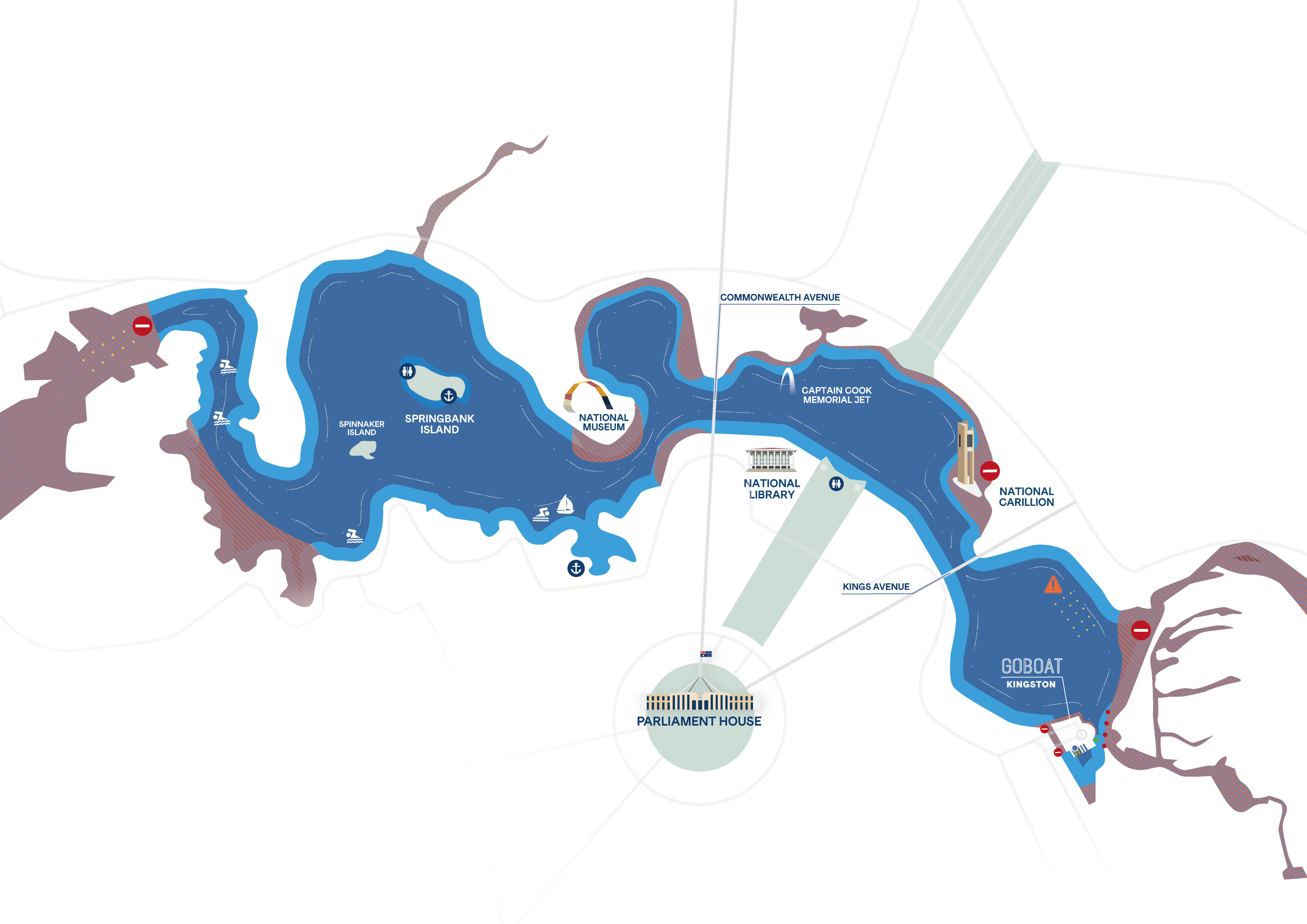 2.5 hours or more: Perfect if you’d like to stop and explore. You can visit Springbank Island (with toilets and BBQs) or dock at Yarralumla Yacht Club to enjoy fish and chips at Snapper on the Lake.