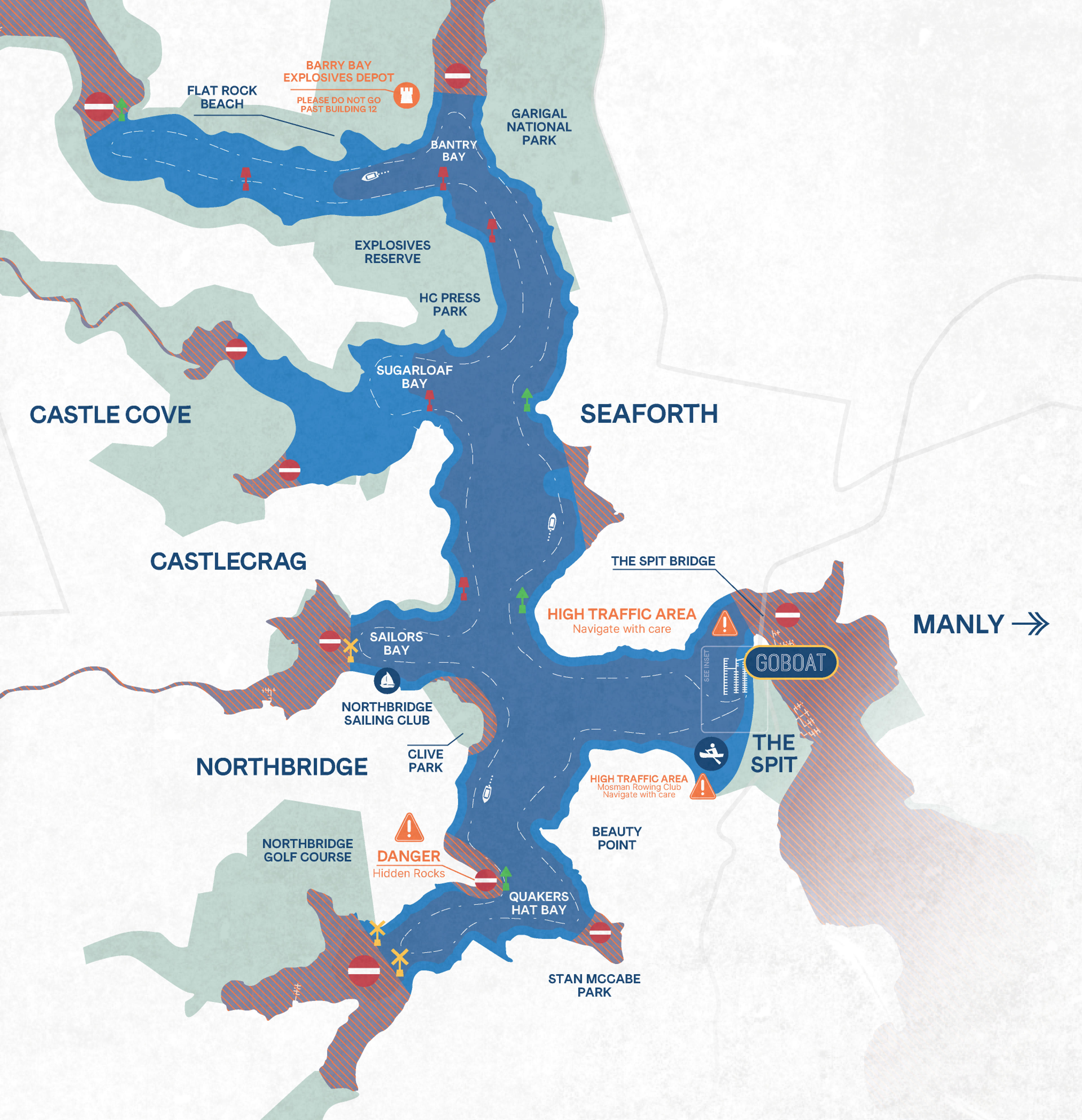 Sail past the Northbridge Sailing Club, Sugarload Bay, and Flat Rock Beach.