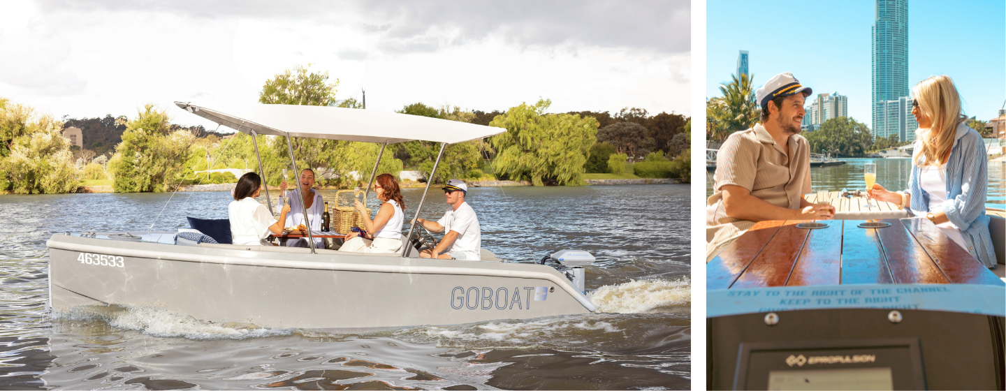 Featuring a more powerful e-motor, premium seat cushioning, and state-of-the-art centre console steering, GoBoat+ is the next evolution of the GoBoat experience. Every GoBoat+ booking also recieves a bluetooth speaker hire and esky (with ice) hire!